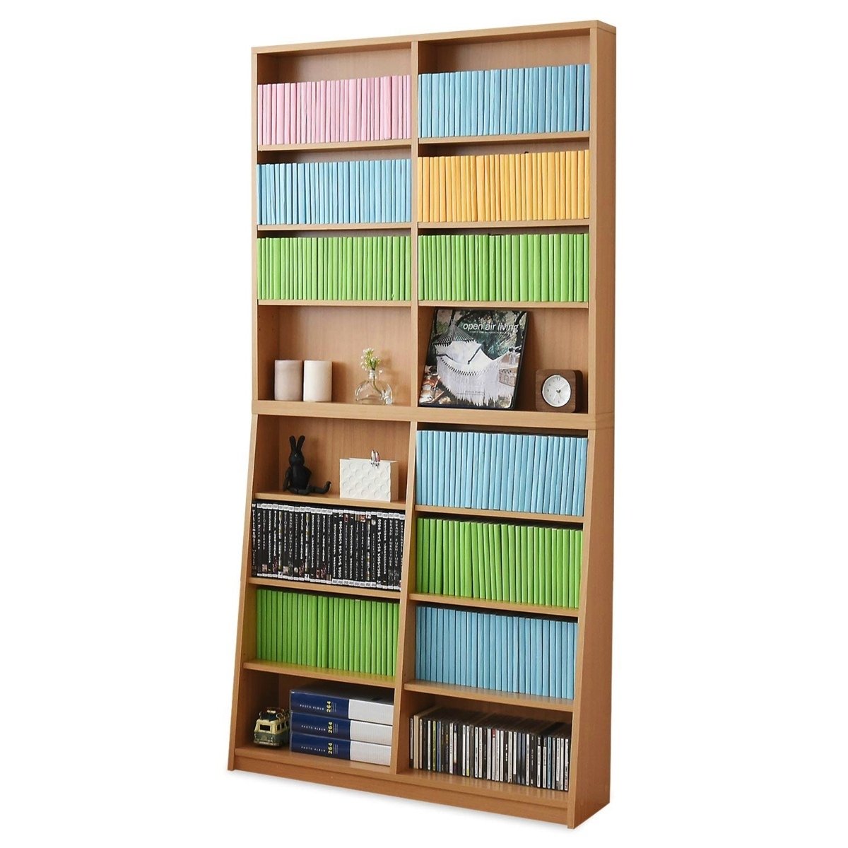 90幅で下段は上段より奥行を持たせ、文庫本だけでなく最下段は辞書なども収納可能な安定感抜群の書棚です。