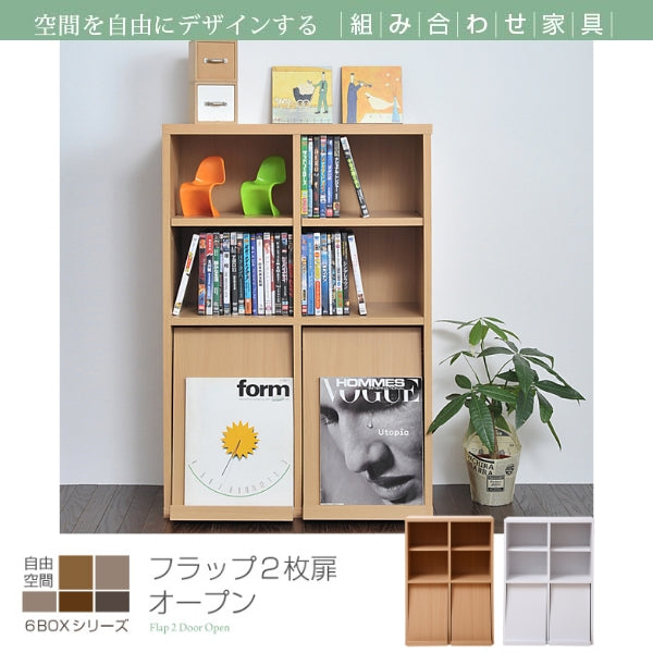 6種類のボックスを自在に組み合わせてオリジナルの壁面収納をつくれる6BOXシリーズ。リビングに最適。前面のフラップ扉には雑誌がディスプレイできます。扉内には雑誌のバックナンバー等収納して。オープン部融合タイプなので、用途はさまざまです。